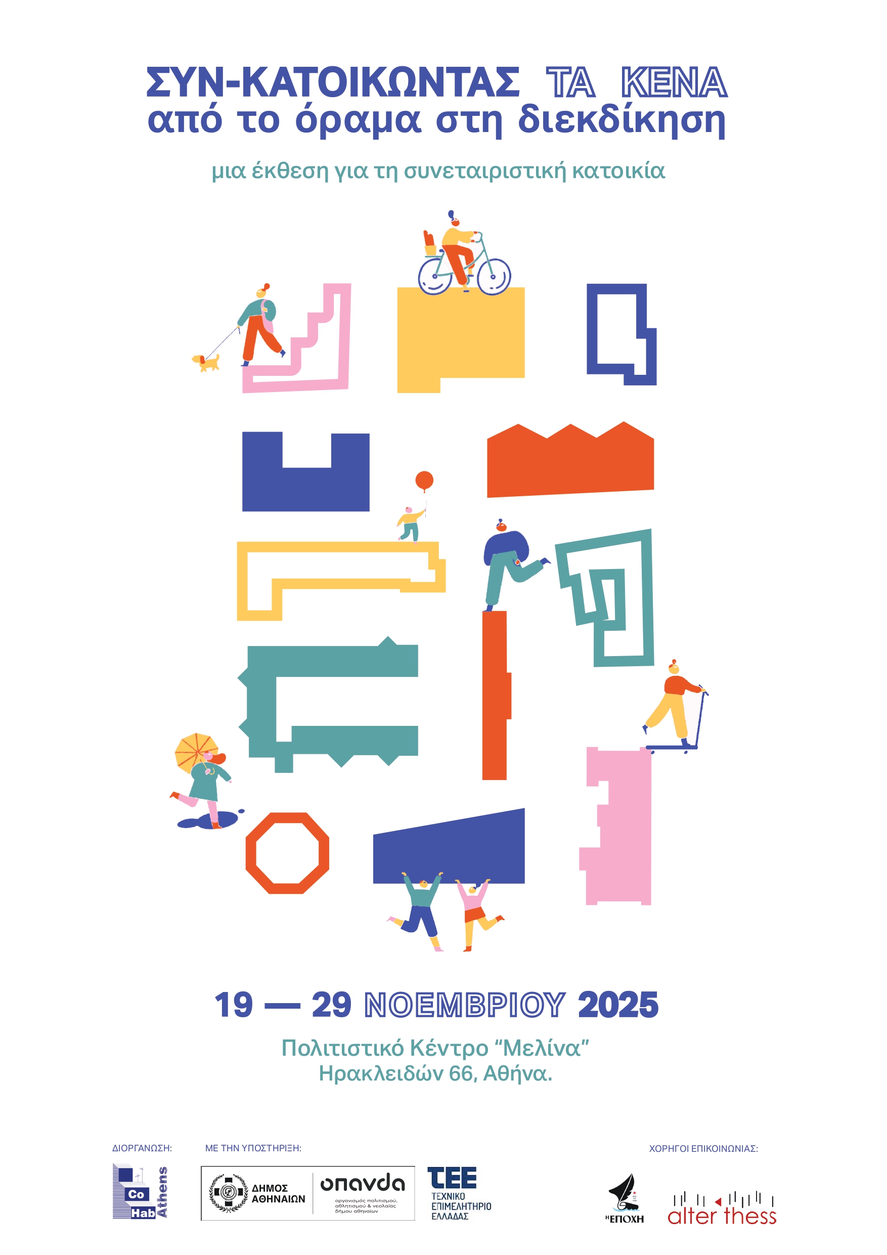 Το  CoHab Athens πραγματοποιεί έκθεση για τη συνεταιριστική κατοικία «Συν-κατοικώντας τα Κενά: Από το όραμα στη διεκδίκηση» στην οποία θα παρουσιαστούν τα αποτελέσματα του Νεανικού Συνεργατικού Διαγωνισμού «Συν-κατοικώντας τα Κενά» για τη Μετατροπή Κενών Κτιρίων σε Στεγαστικούς Συνεταιρισμούς έναν χρόνο μετά την ολοκλήρωσή του στο Πολιτιστικό Κέντρο “Μελίνα” του Δήμου Αθηναίων, Ηρακλειδών 66, Θησείο.